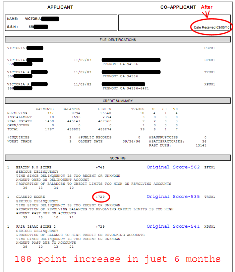 You can see that the scores significantly went up after the the second round of work that CIQ performed (~6 months). There was a midscore gain of 188 points. We have hundreds of success stories like this. Please come into our office and ask to see our CIQ Success Stories 700 club.