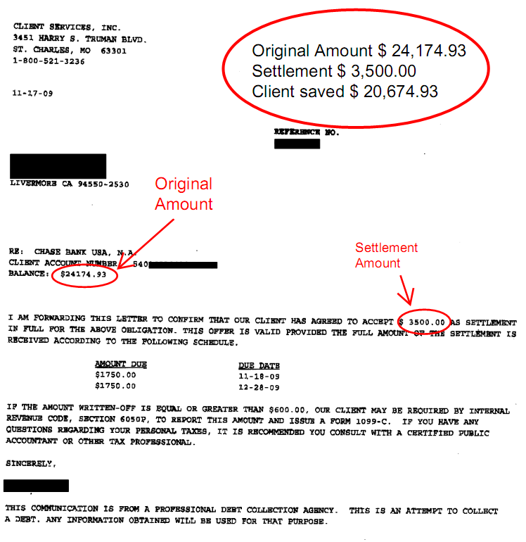 Our client came to use with a debt of $24,174.93 with Chase Bank. With our debt negotiation team working closing with the collection services they were able to settle the debt for $3,500 - for a savings of $20,647.93! Incredible! We have hundreds of success stories like this. Please come into our office and ask to see our CIQ Success Stories 700 club.