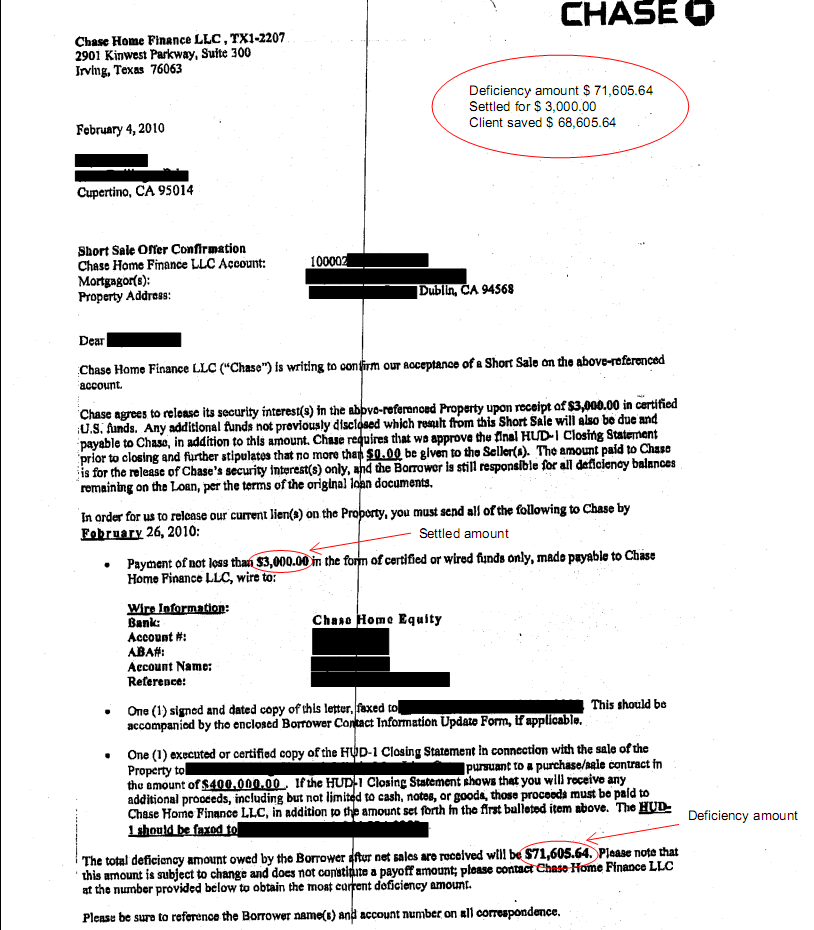 This is a short sale deficiency amount. Home owner was able to save $68,605.64 by settling the deficiency amount of $71,605.64 for just $3,000. For more information about this complicated transaction please stop in or call us. We have hundreds of success stories like this. Please come into our office and ask to see our CIQ Success Stories 700 club.