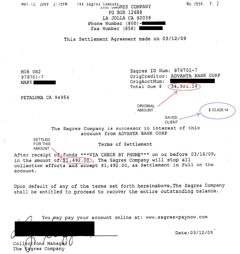 Client came into our Debt Negotiation Department with a 6 month old outstanding debt with The Sargis Company. Original debt was for $34,921 and was settled for $1,492 This was a $33,429 savings to the client