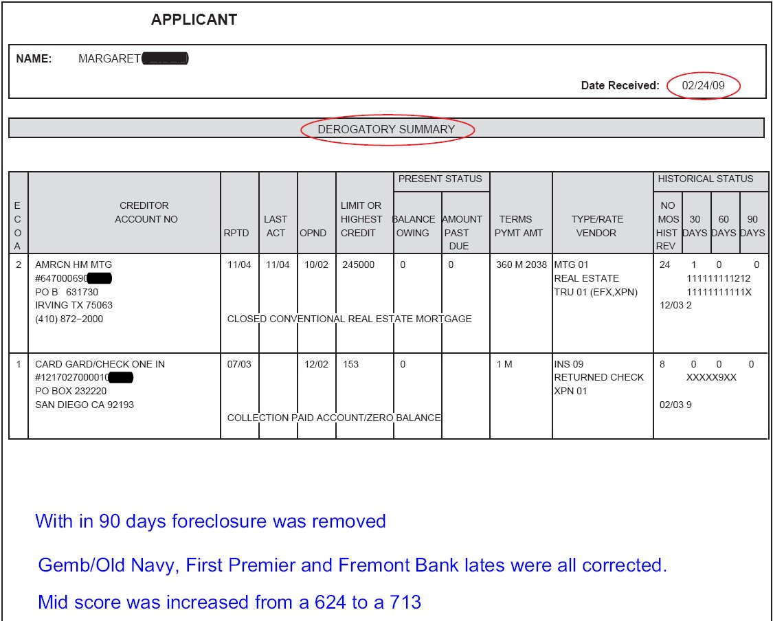 Slide 1 is a initial credit report with a Foreclosure, multiple lates and a low initial score. Slide 2 ( after 90 days ) shows Foreclosure Removed and Lates removed on GEMB, Old Navy, First Premier and Fremont Banks and a score increase of 89 points.