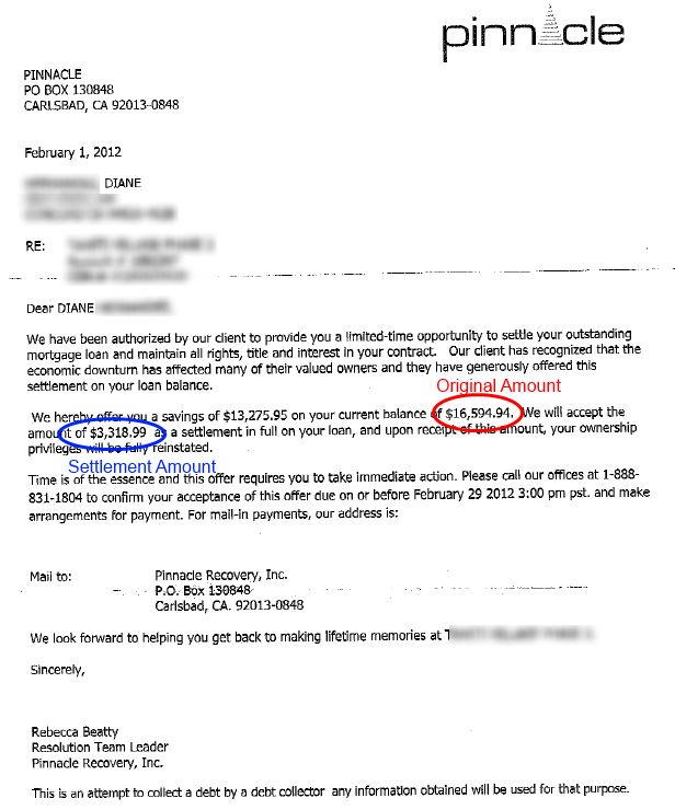 A client came to us with a timeshare debt of $16,594.94. Our team was able to settle their debt for $3,318.99. - a savings of $13,275.95! Their timeshare privileges were fully reinstated after payment! We have hundreds of success stories like this. Please come into our office and ask to see our CIQ Success Stories 700 club.