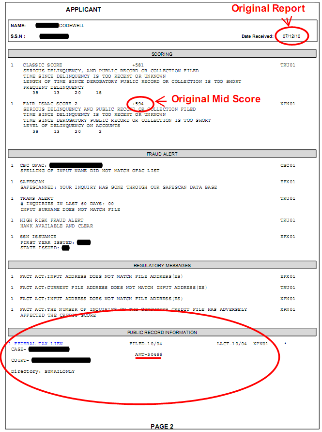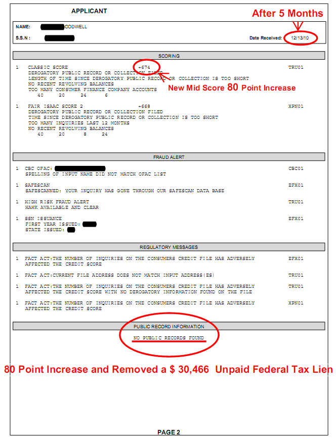 Our came to us with a midscore of 594. Of note, he also had a federal tax lien of $30,466. Within 5 months of working with us, his midscore was increased to 694 - an increase of 80 points.