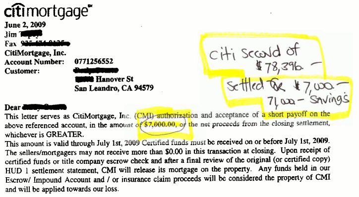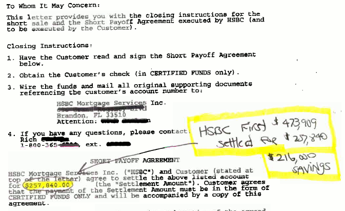 Successful Short Pay accepted with HSBC on first with a $216,000.00 savings and a savings of $71,000.00 on the second with Citi. That is a $287,000 savings.