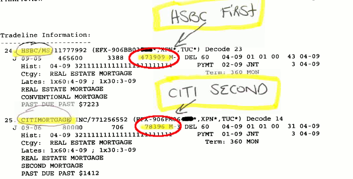 Slide 1: Initial credit report with first loan listed with HSBC for $473,909.00 and second listed with Citi for $78,396.00