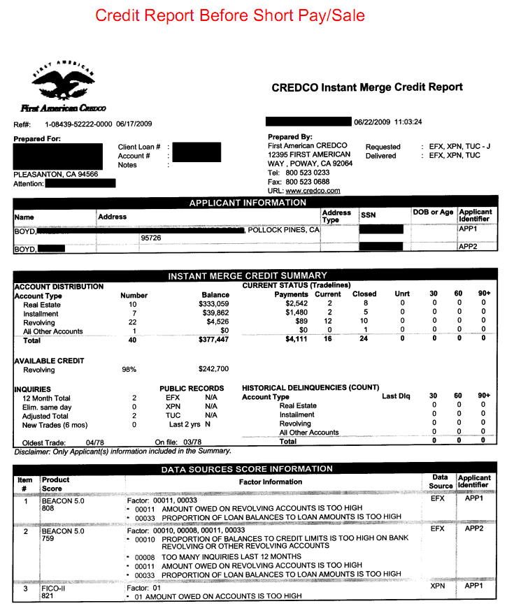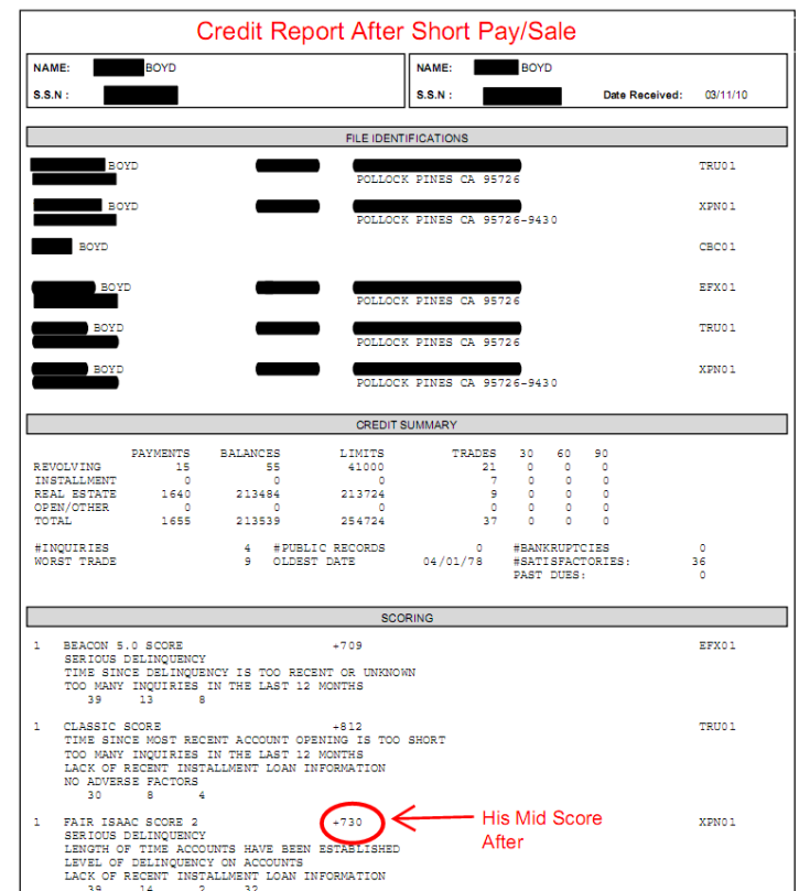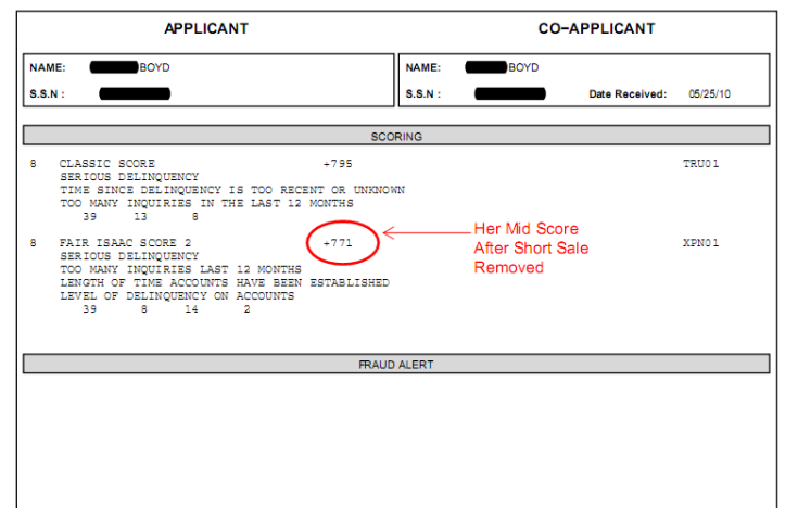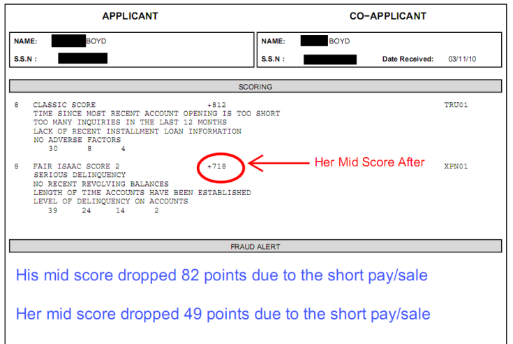 Of interest, you can see how much a short sale can affect a credit score, dropping 82 and 49 points after the short sale. With the tighter lending practices, a credit score change like that might equal several hundred thousand dollars over a life of a loan due to a higher rate.