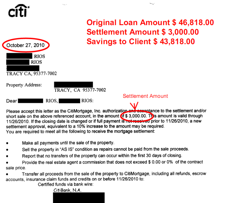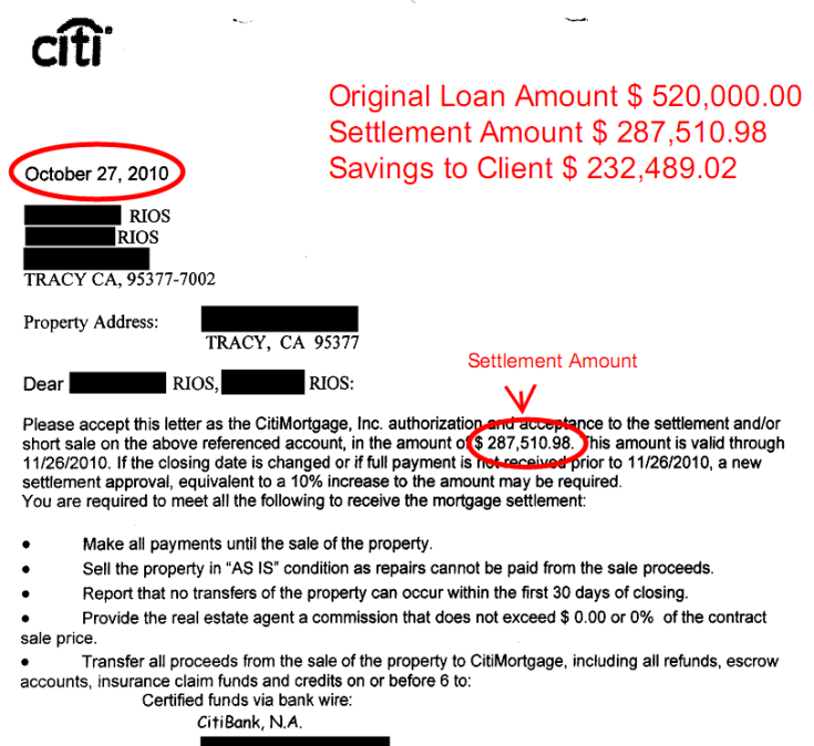 This home owner had a first mortgage loan of $520,000, with a second of $46,818. They were able to get the loan settled for $287,510.98 on the first and $3,000 on the second. This amounts to a savings of $276,307.02!