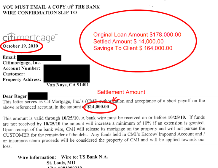 This home owner had a mortgage loan of $178,000. They were able to get the loan settled for $14,000. This amounts to a savings of $164,000.00 or roughly a 92% decrease.