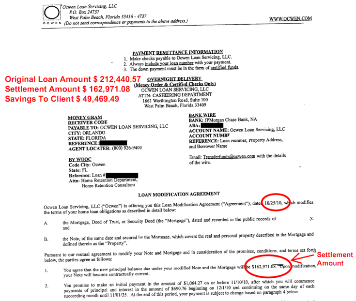 This home owner had a mortgage of $220,440.57. They were able to settle for $162,971.08. That amounts to a savings of $49,469.49 - or 23% of the original loan.